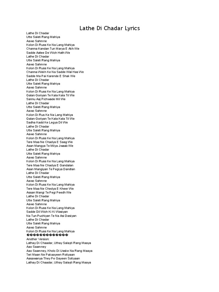Lathe Di Chadar Lyrics : Lathe di chadar utte saleti rang mahiya aawo sahmne kolo di rus ke na lang mahiya.